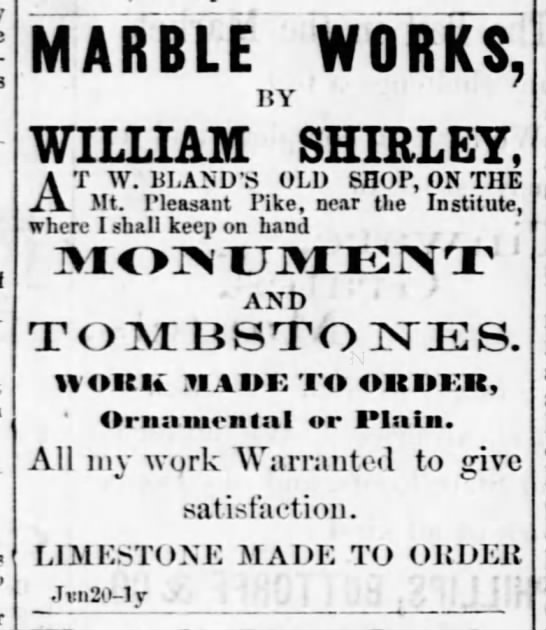 Shirley Monuments 1871 Posted on October 4, 2018 by historicmaurycounty Trackbacks are closed, but you can post a comment. 1871 ad for William Shirley